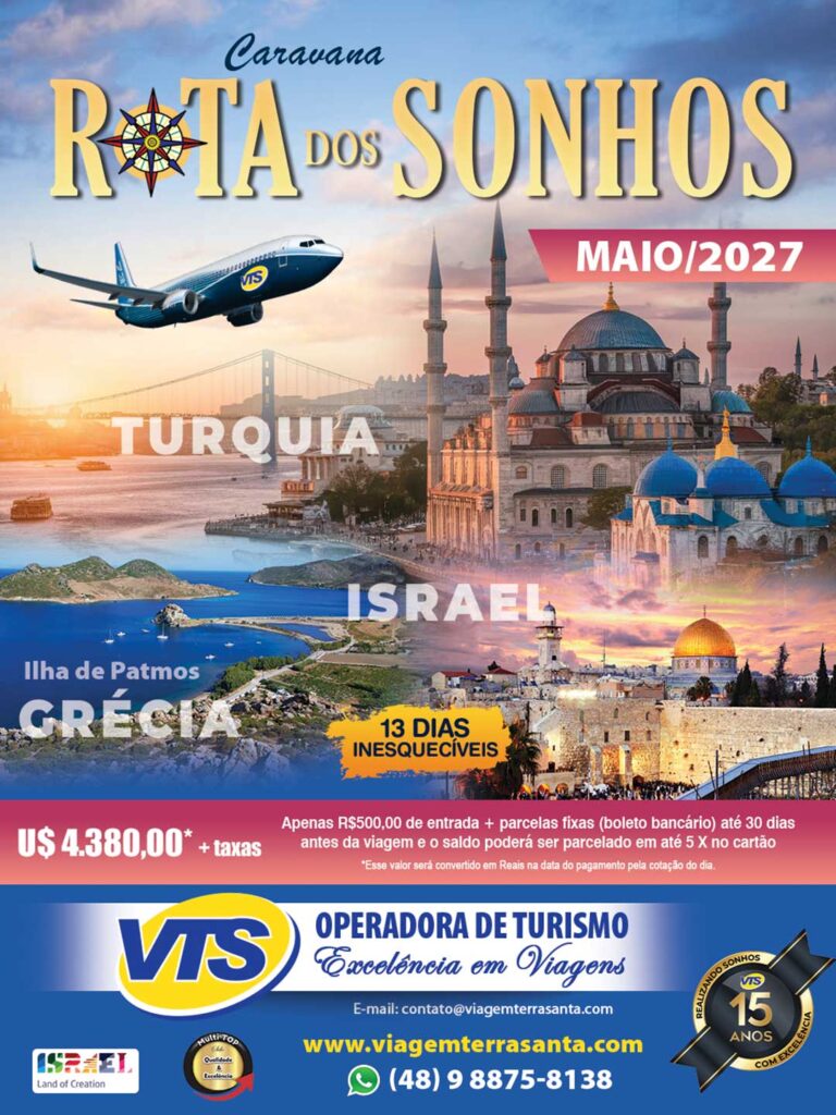 Durante toda a viagem, viva momentos únicos de comunhão, aprendizado e renovação espiritual. Com guias especializados e acompanhamento pastoral, cada parada será uma oportunidade de conectar sua fé à história bíblica e fortalecer sua caminhada com Deus. Desfrute de celebrações, momentos de oração e experiências culturais que tornarão esta caravana muito mais do que uma viagem — uma verdadeira jornada de transformação e fé viva.